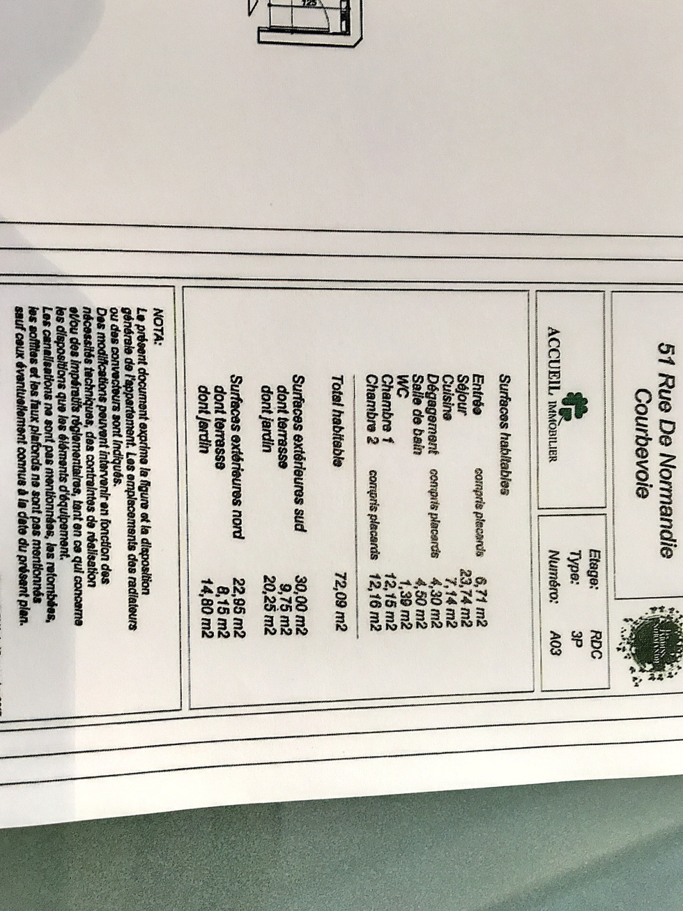 Courbevoie, entre la gare et la Défense, rue de Normandie, immeuble 2018 de standing, spacieux 3 pièces en rez de jardin MEUBLE de 72,09m2 , en retrait de la rue il n'a pas de nuisance de circulation, il dispose d'une entrée avec placard, d'un séjour et cuisine américaine équipée donnant sur une première terrasse/ jardin de 30m2 exposée sud, en partie nuit, un dégagement avec placard, un wc avec lave-mains, une salle de bains , 2 chambres donnant sur une seconde terrasse/ jardin de 20m2. Parking en sous-sol, chauffage et eau collectifs. Disponible le 3 novembre. Honoraires en résidence principale 1080€, en résidence secondaire ou bail société 1900€ hors taxes.